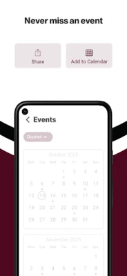 NEVER MISS AN EVENT The event section shows a list of events throughout the district. Users can add an event to their calendar and share the event with friends and family with one tap.